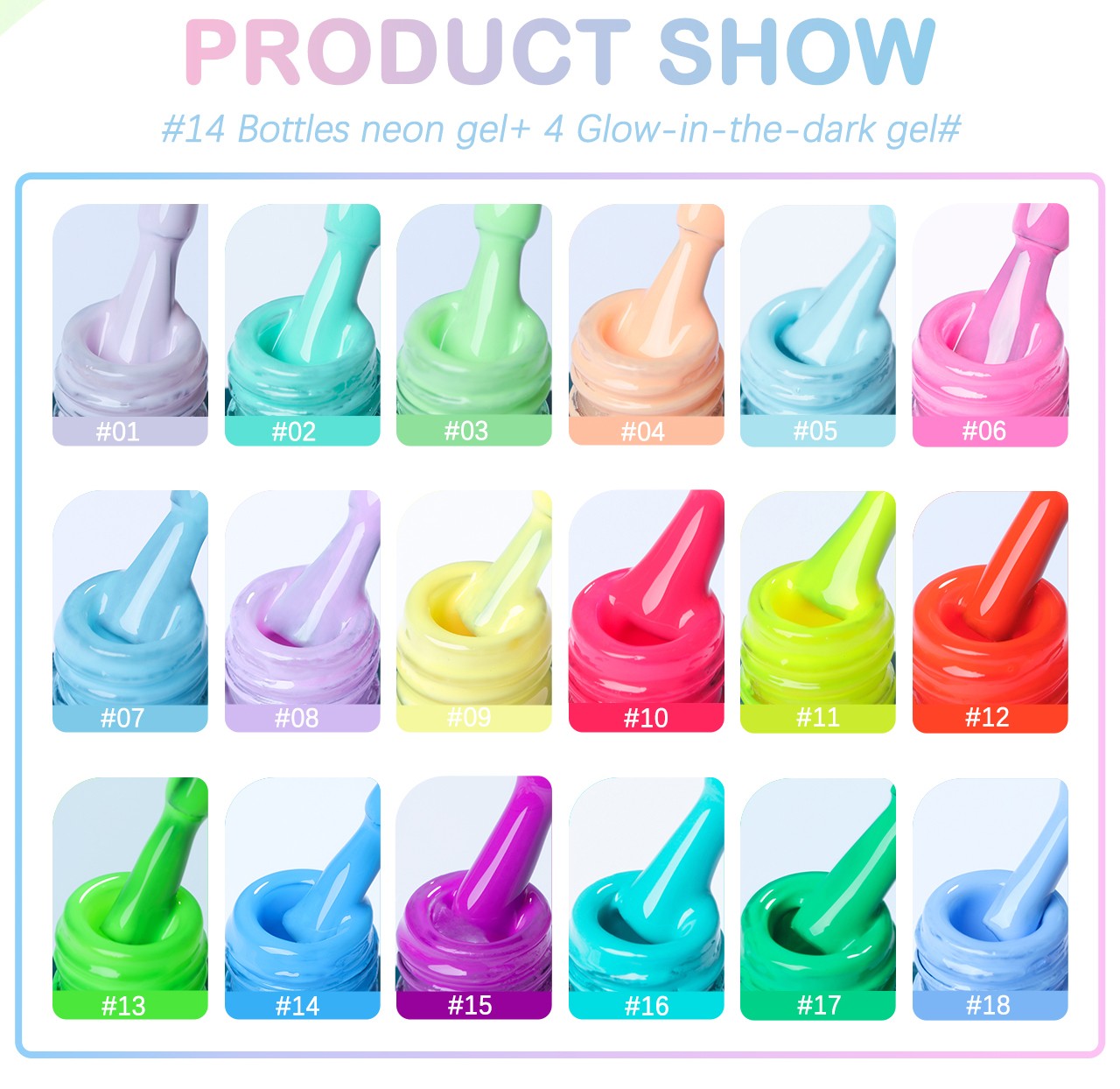 Product name: | 18 colors candy neon gel polish set | Feature: | Long Lasting/easily soak off/easily brush on |