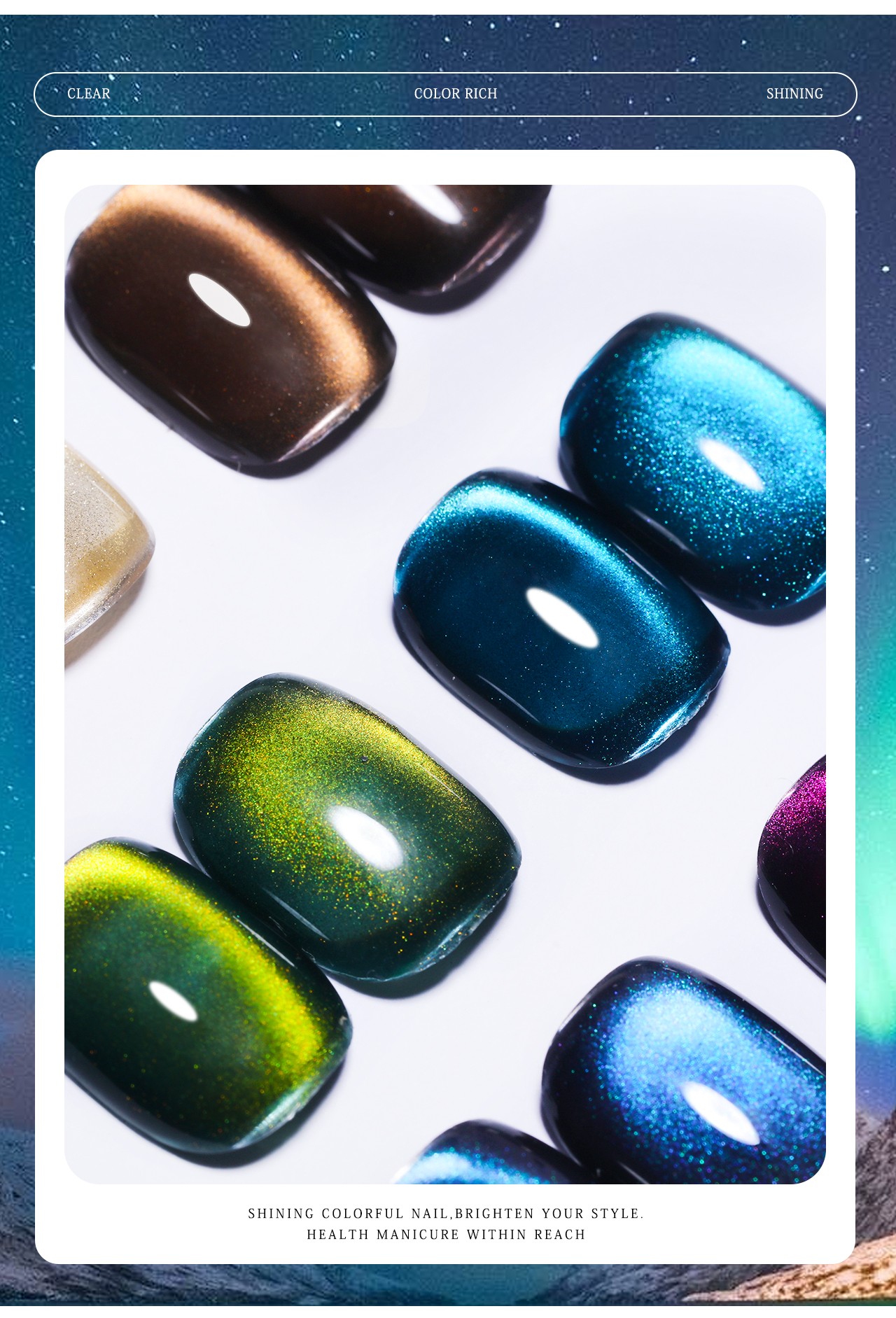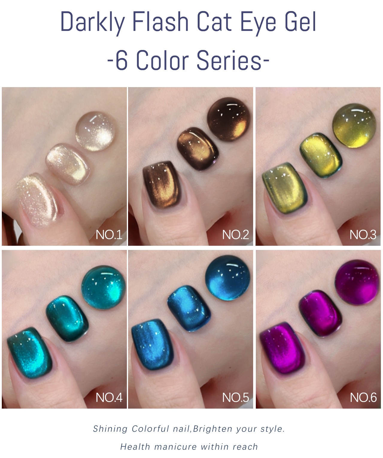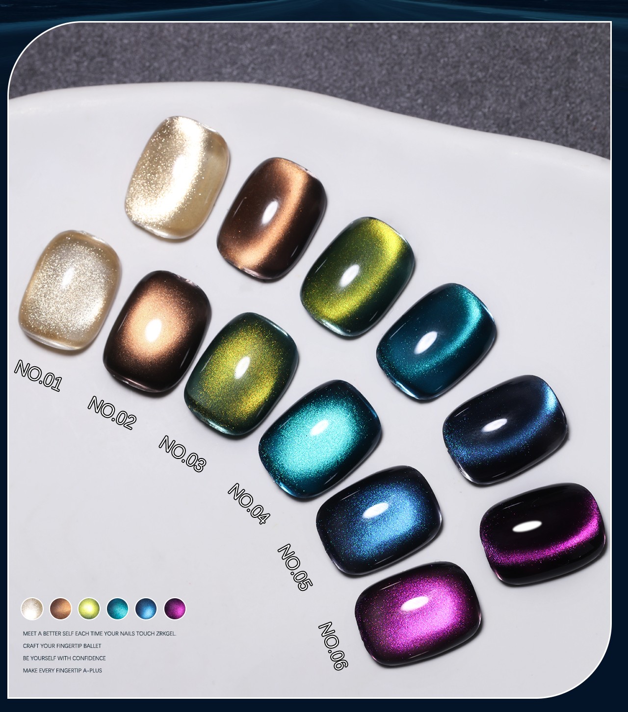 | Product name: | ZRKGEL 6colors darkly flash cat eye gel polish set | Feature: | Long Lasting/easily soak off/easily brush on |