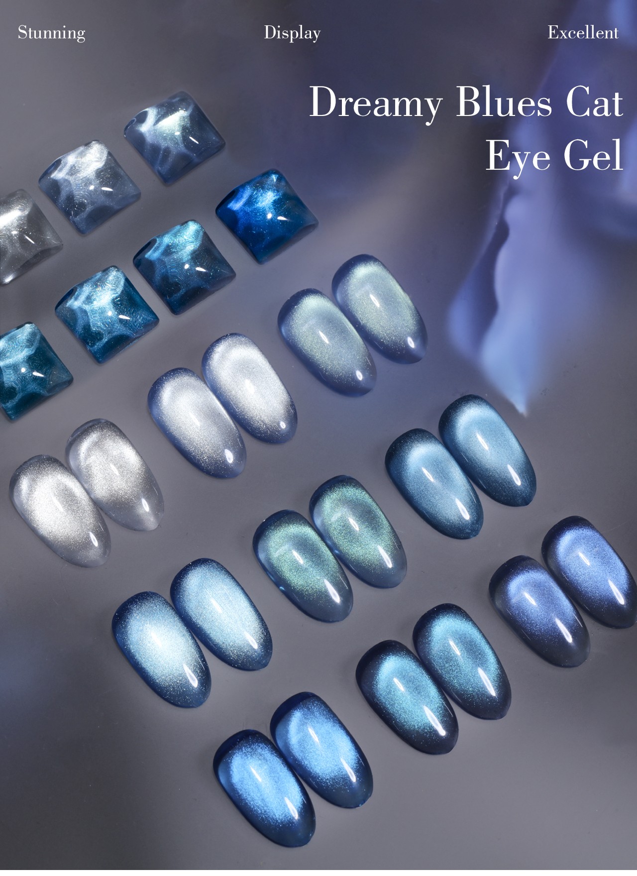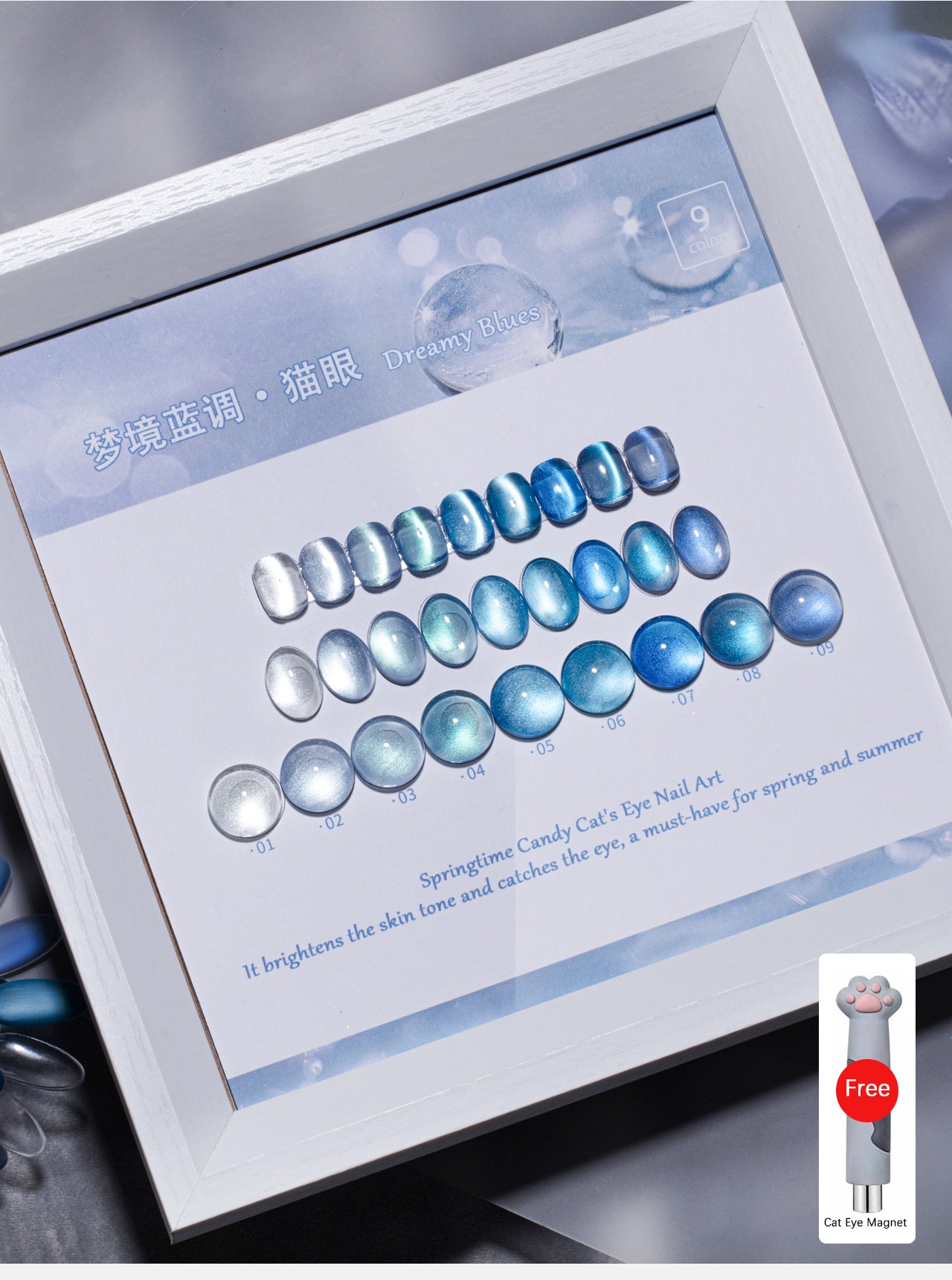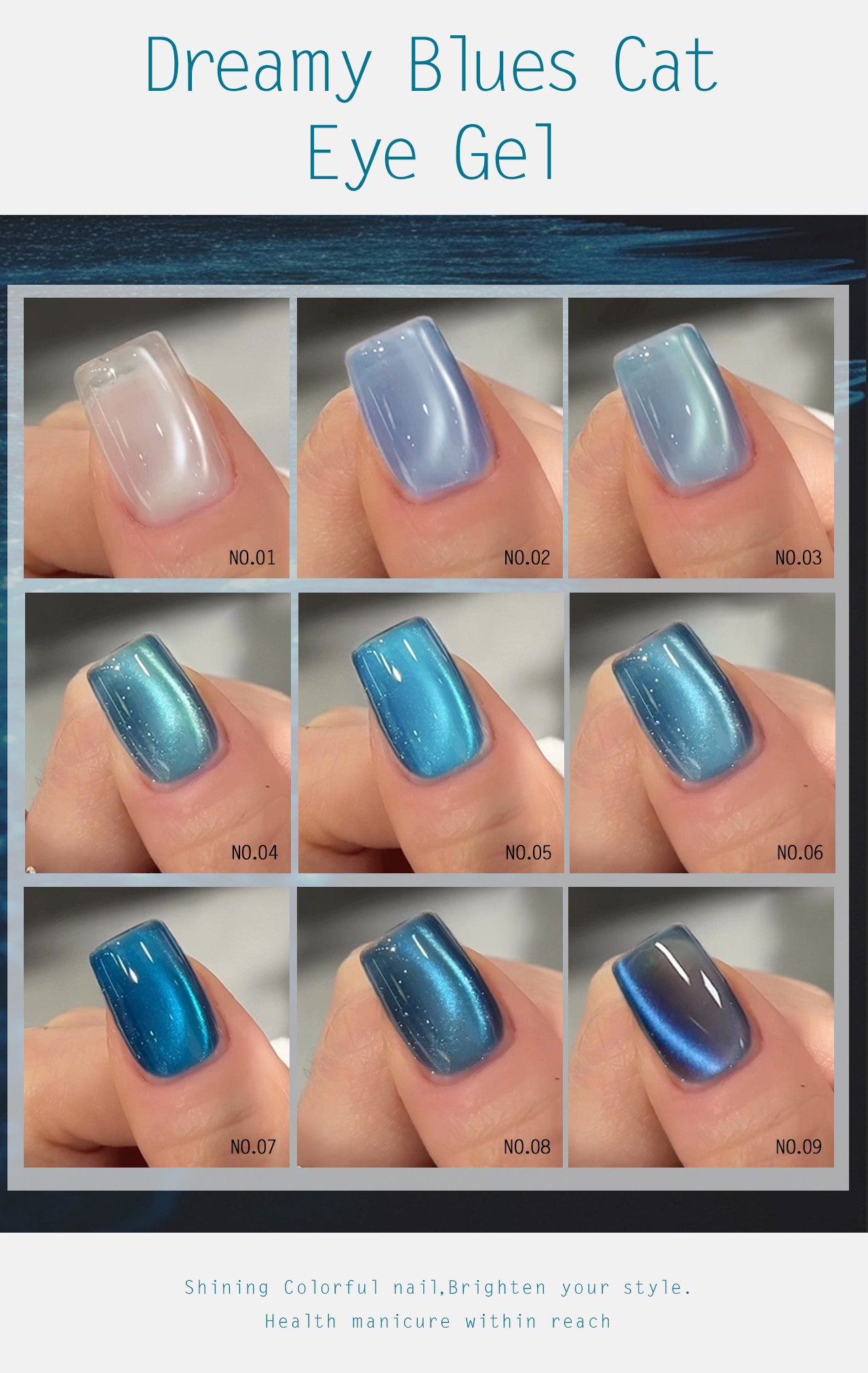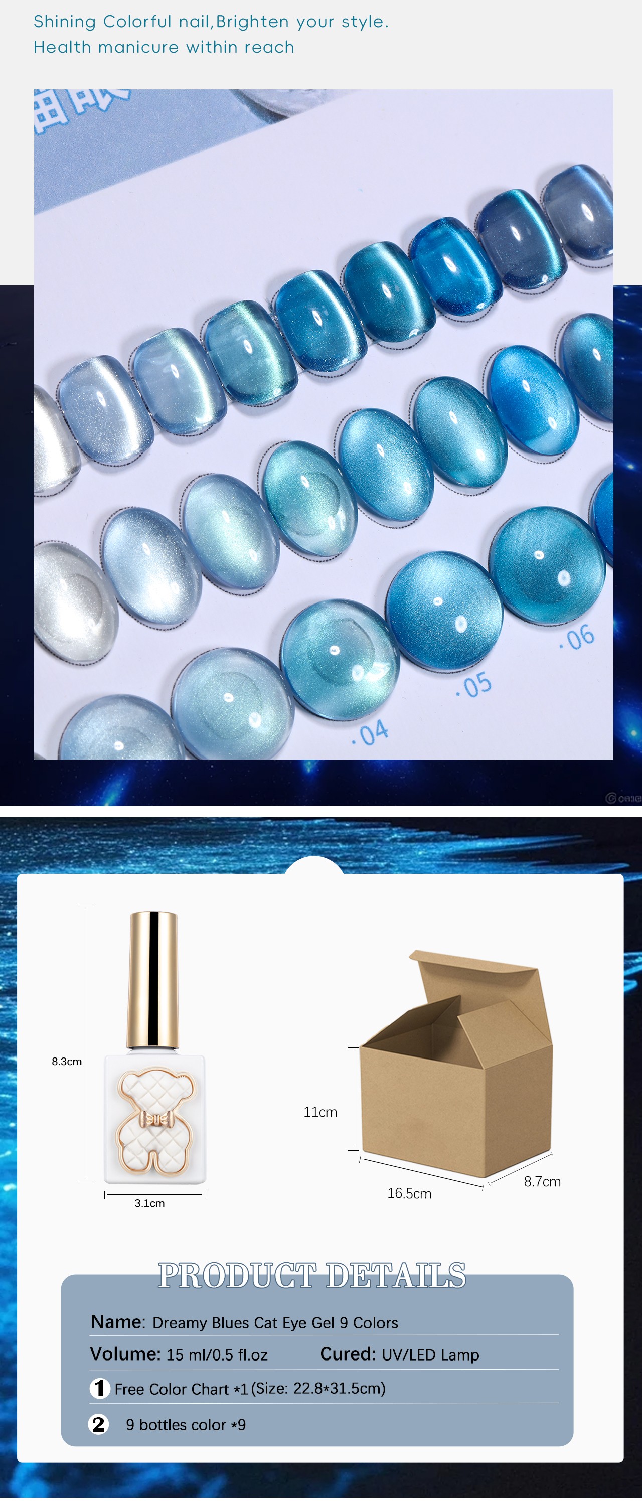 | Product name: | ZRKGEL 9 colors Dreamy Blues cat eye gel polish set | Feature: | Long Lasting/easily soak off/easily brush on |