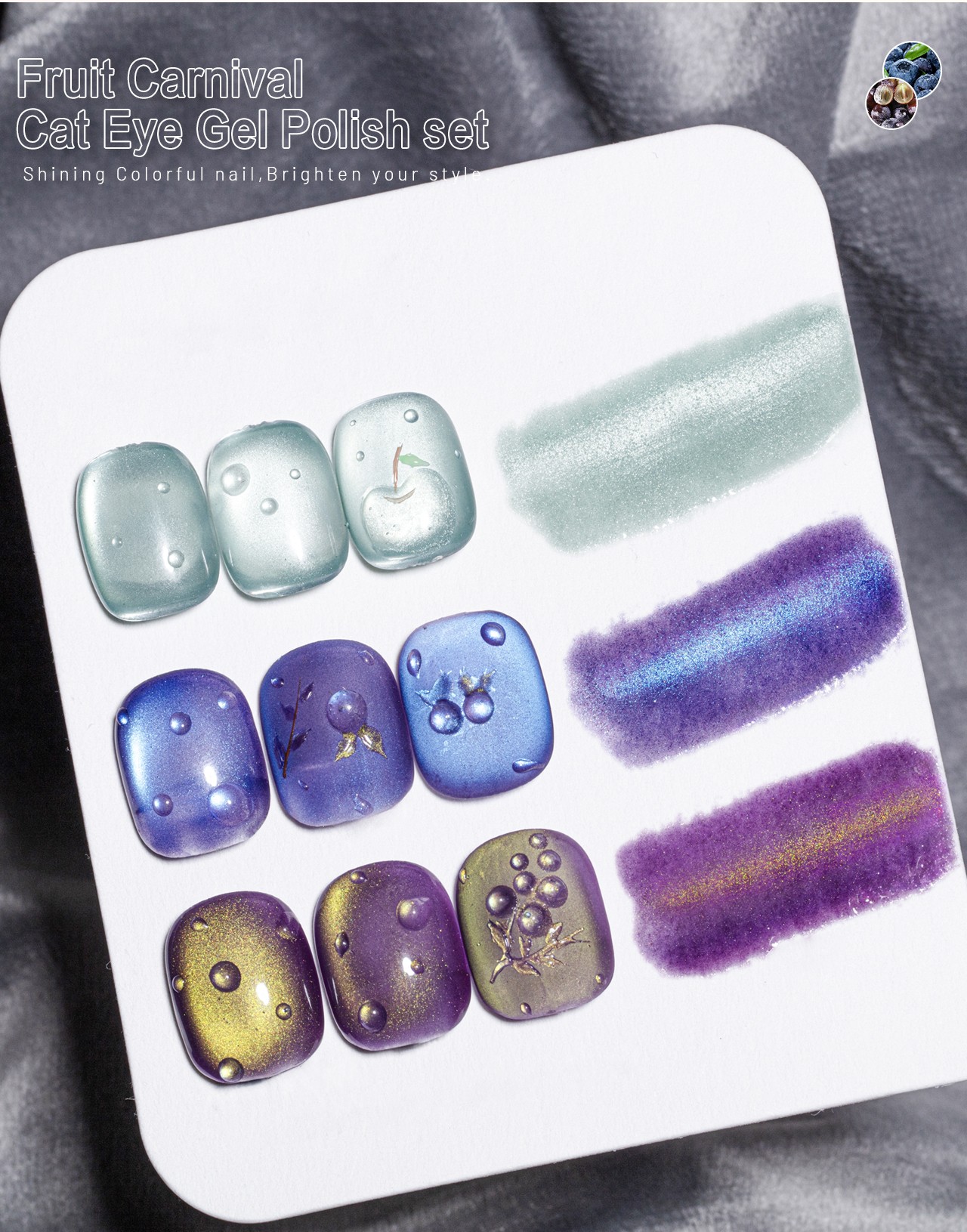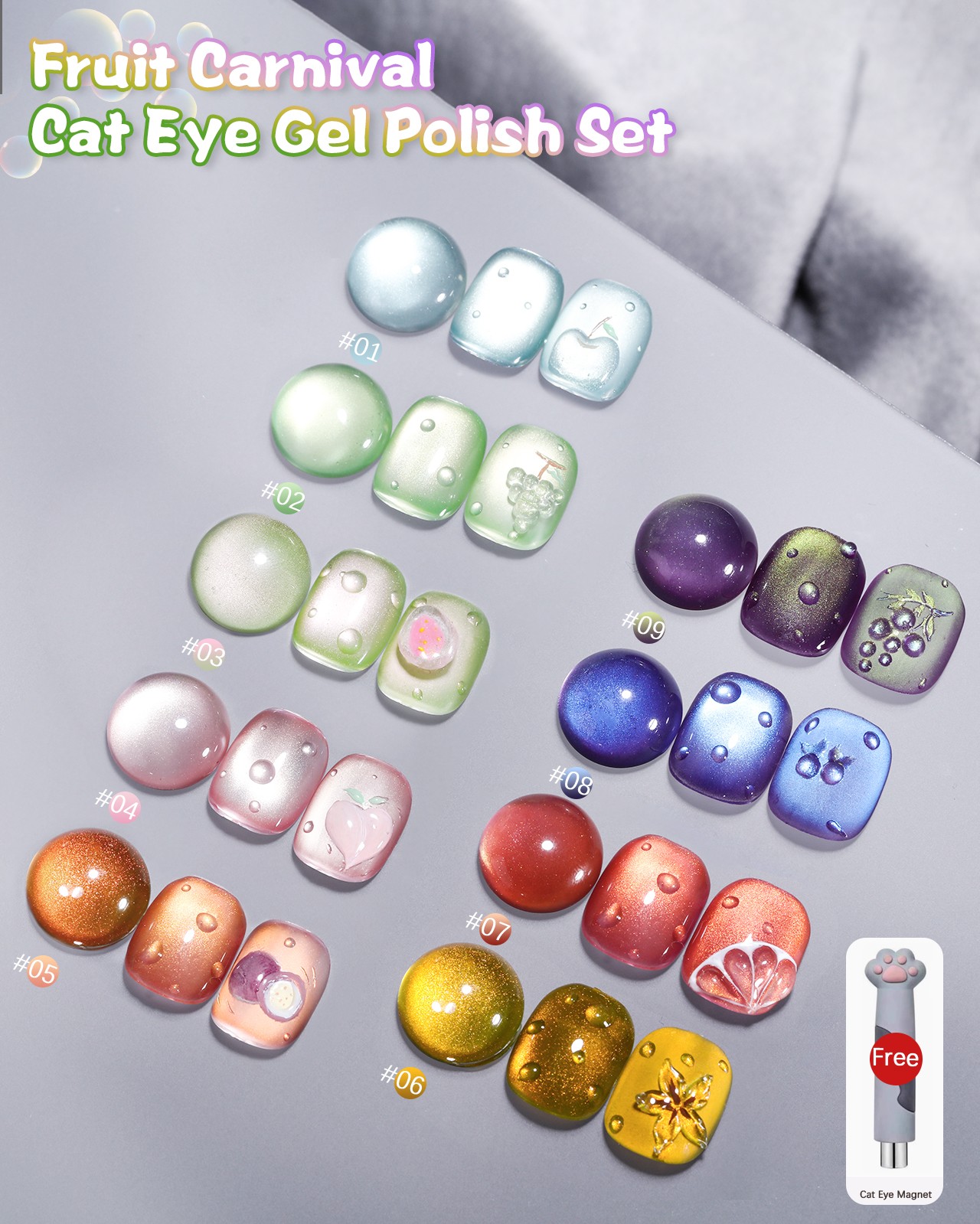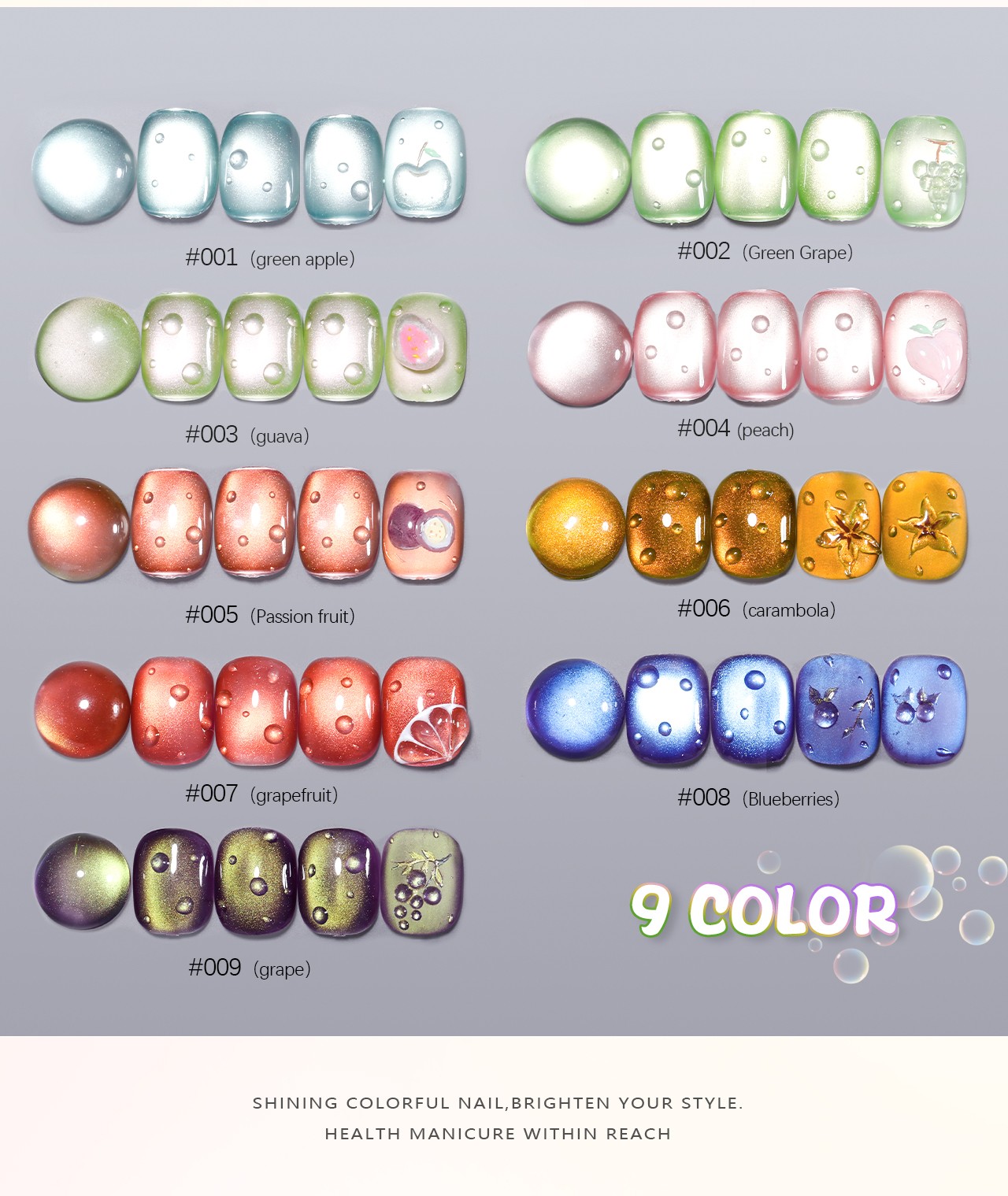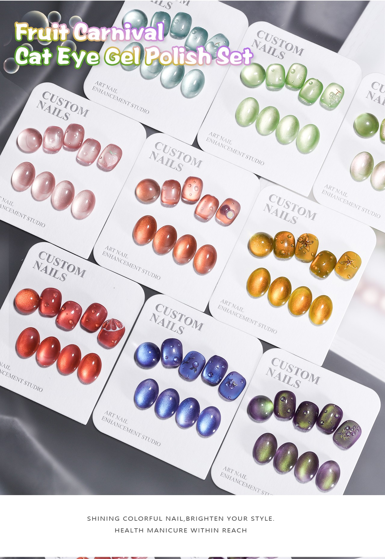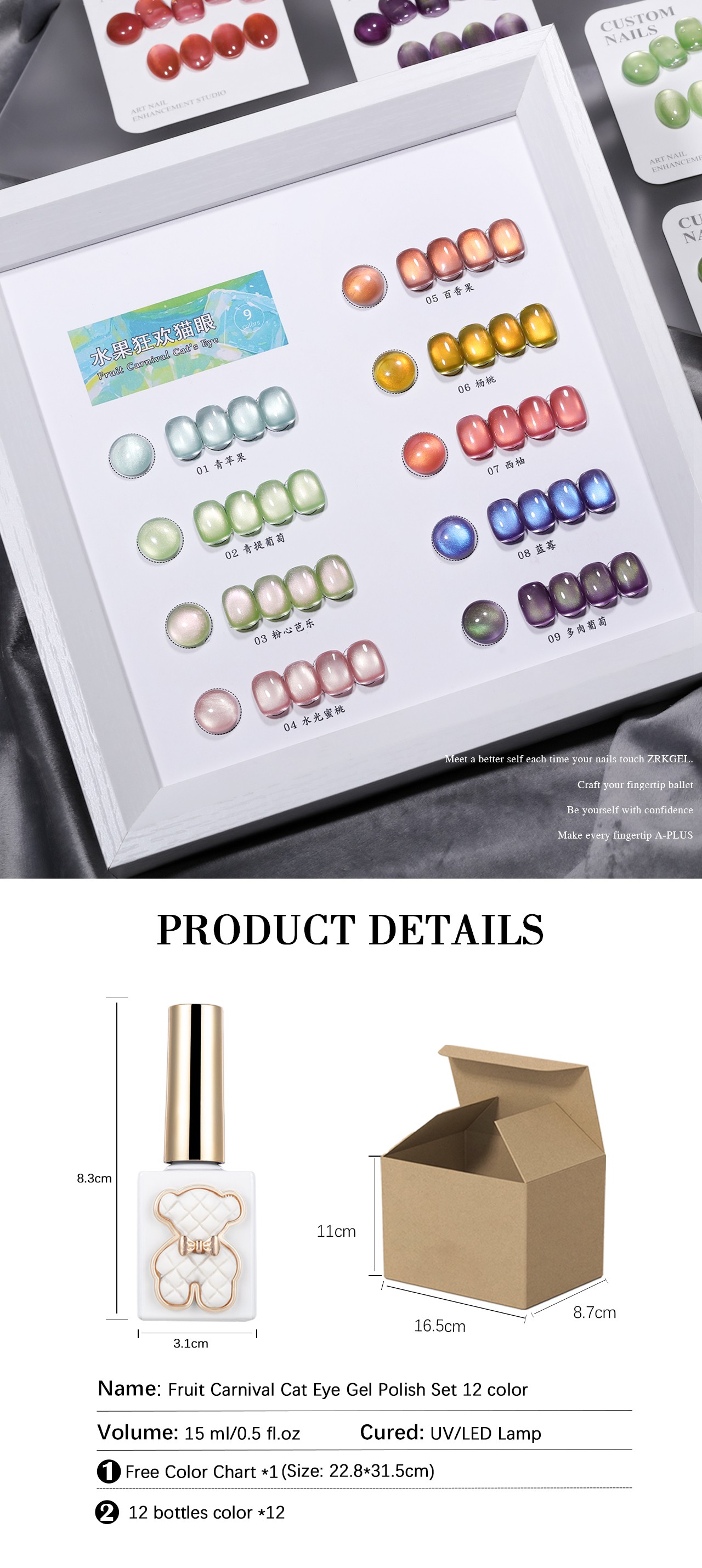 | Product name: | ZRKGEL 9 colors Fruit Carnival cat eye gel polish set | Feature: | Long Lasting/easily soak off/easily brush on |